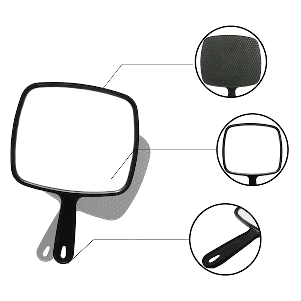 O seu formato retangular tipo “TV” proporciona uma área ampla de visualização, permitindo verificar com precisão a parte traseira da cabeça, degradés, fades, colorações, penteados e todos os detalhes do trabalho realizado. Leve, resistente e ergonómico, é um acessório essencial para qualquer ambiente profissional.