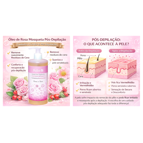 O Óleo de Rosa Mosqueta da Pollié foi desenvolvido para atuar exatamente nesse momento crítico da pele, ajudando a remover resíduos de cera, enquanto proporciona uma sensação imediata de suavidade e conforto.